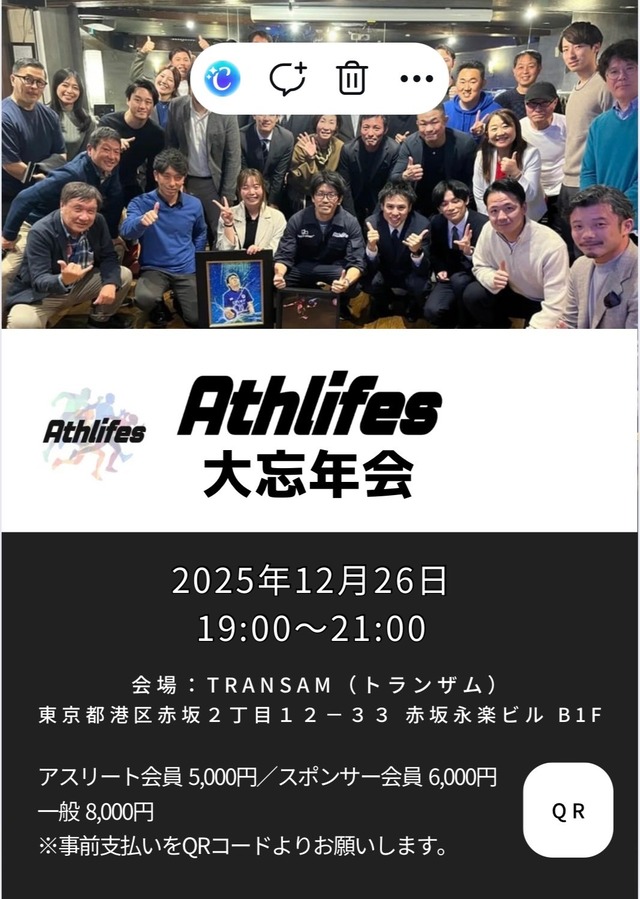 2025年12月26日 『Athlifes 2025 大忘年会』 Athlifesスポンサー様専用の参加チケットです。 皆様是非ご参加下さい。 MAX60名の貸し切りで開催予定です。 ---------------------------- 2025年12月26日 19:00~21:00 (21:30完全撤収) @タイ&ダイニングバーTRANSAM 東京都港区赤坂2-12-33 赤坂永楽ビルB1 【会費】 Athlifesアスリート 5,000円 Athlifesスポンサー様 6,000円 ビジター様 8,000円