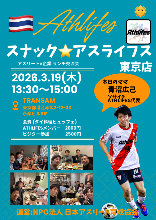 2026年3月19日 『スナック⭐︎アスライフス東京店(ランチ交流会)』 Athlifesメンバー専用の参加チケットです。 皆様是非ご参加下さい。 ---------------------------- 2026年3月19日 13:30〜15:00 (15:30完全撤収) @タイ&ダイニングバーTRANSAM 東京都港区赤坂2-12-33 赤坂永楽ビルB1 【会費】 Athlifesメンバー 2,000円 ビジター様 2,500円
